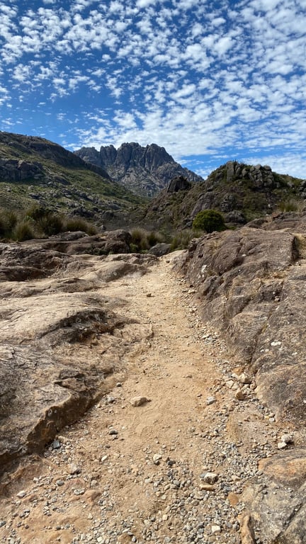 🥾 Distância: 14km (ida e volta - Aproximadamente), com desníveis e trechos de escalaminhada próximos a Base das Prateleiras. Terreno desnivelado e íngreme pra acessar a Pedra do Altar